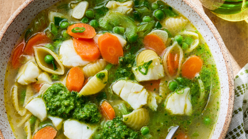 - When ready to serve, heat the soup back up to a simmer and add the cod pieces and keep simmering until cooked through and starting to flake apart, about 5 to 7 minutes. Season the soup with salt, if needed then ladle into bowls and stir in a generous amount of pesto and the green parts of the scallion into each bowl.