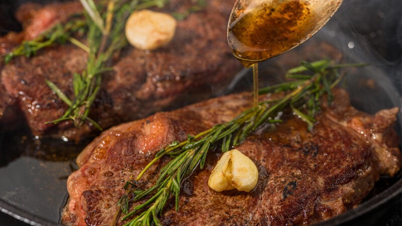 - Add the butter to the skillet; it will melt quickly. Add the garlic, rosemary and thyme. Gently and carefully tip the skillet, collect the melted butter in a tablespoon and pour it over the steaks. Continue cooking and basting the steaks, flipping once or twice more and continuing to baste with the butter mixture, until a meat thermometer stuck into the thickest part of the steak reads 120ºF for medium rare, 1 to 2 minutes longer.