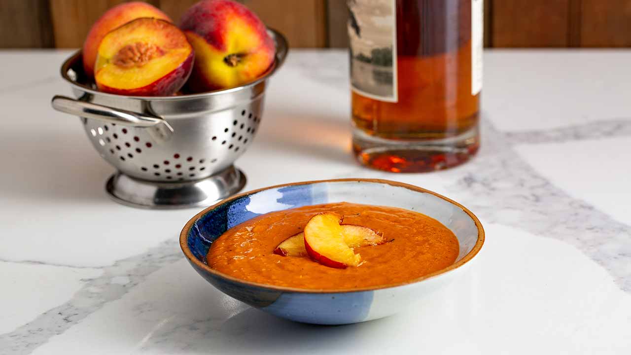 This barbecue sauce is thick and flavorful, thanks in large part to whole, oven-roasted peaches that get pureed with all the other ingredients. This sauce features many layers of flavor, including onion, bourbon, honey, apple cider vinegar, and plenty of spices.