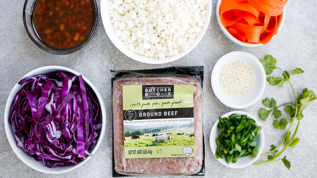 One of the most satisfying components of this bowl is the varied textures. Crunchy shredded cabbage and thinly peeled ribbons of carrots add a nice crunch alongside juicy crumbled ground beef. Everything sits on a bed of tender cauliflower rice. Plus, you can also switch up the ingredients based on whatever you have in the fridge — broccoli, green beans, snow peas or asparagus would all work nicely.