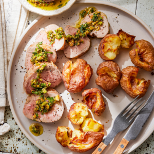 - Slice the pork tenderloins into ½-inch medallions and arrange on the platter with the potatoes. Generously drizzle the sauce over the top. Toss the arugula with red wine vinegar and the remaining 2 tablespoons of olive oil, season lightly with salt and pepper, and serve alongside.