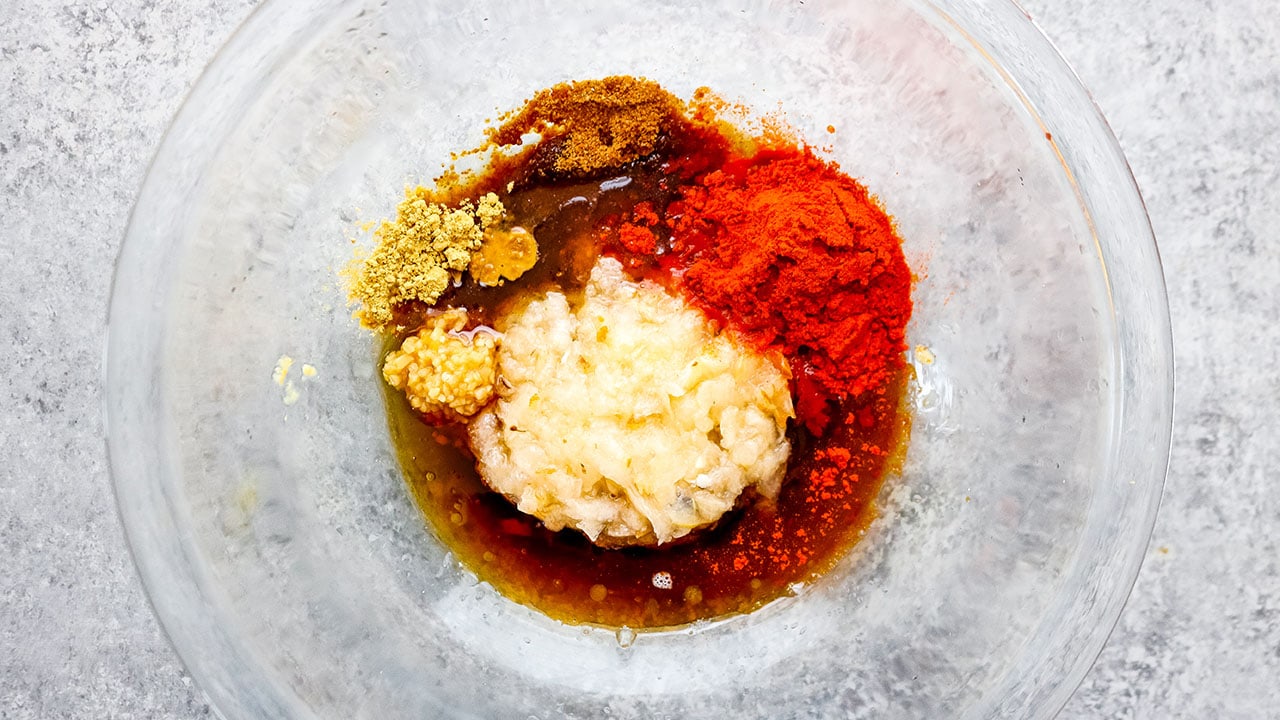 1. Combine ingredients for marinade in a mixing bowl and stir well.