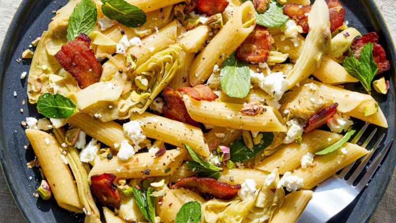 This light pasta feels like the meeting of seasons with wintry artichokes rich ButcherBox bacon with light spring-y mint and salty feta. Large pieces of bacon cook first in the pan setting the mood and underlying flavor for the pasta with its distinct smokiness while onions, plenty of garlic sweeten and aromatize this pasta that at once feels like it should be eaten immediately or could be stored and served as a cold pasta salad for those warmer spring days. Out of convenience, this recipe calls for canned artichokes which are boon, because they offer a light briny flavor that further balances the pasta from being overly rich from the bacon and feta. If you don’t happen to have ButcherBox’s bacon on hand, try this with ground Italian sausage instead.