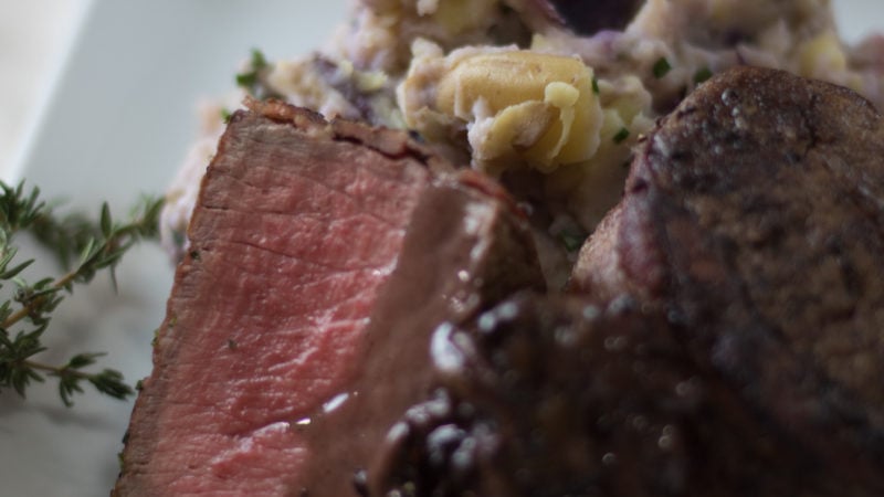 - Preheat cast-iron pan, add oil and sear filets on all sides, 2-3 minutes per side. Add remaining butter and baste for additional 2 minutes on all sides. Place pan in oven and roast for 8-10 minutes.