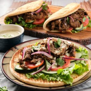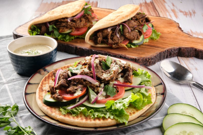 Shawarma is a popular street food from the Middle East consisting of thin slices of spiced meat. It’s traditionally cooked on a vertical rotisserie and then shaved down into manageable portion sizes for wraps. Similar to a Greek gyro in appearance, shawarma is Middle Eastern in taste. For this recipe, we’ll use sliced Butcher Box flank steak instead of a big hunk on a vertical spit. The meat is marinated in spices and then cooked on a skillet or flat top. It makes the kitchen smell delightful – but the best part is digging in!