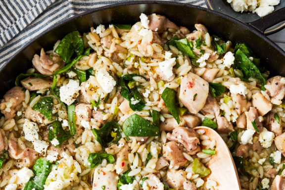 Orzo with Chicken Thighs, Spinach, Feta and Olives
