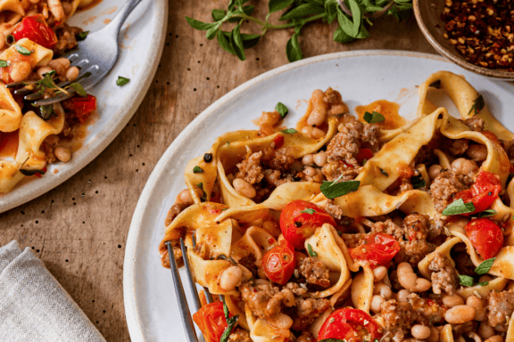 Inspired by the Italian soup “pasta fagioli”—or, as New Yorkers call it, pasta fazool–this pasta dish, featuring beans and Italian sausage, is coated in a buttery, spicy cherry tomato sauce. And let us tell you, this dish is comfort on a plate. It also showcases the versatility of ButcherBox’s mild…