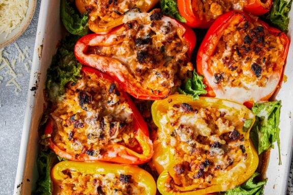 Super satisfying yet light, these stuffed peppers are garlicky, herbaceous (thanks to a generous amount of sage), bright with tomato and cheesy from melted layers of mozzarella. How could turkey not like being paired with such tasty flavors? Lastly, because it’s never bad to have some greens too, escarole (a…