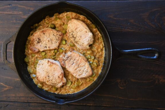 Pan fried pork chops with tangy mustard and pickle sauce may sound like an odd combination of flavors, but if you think more French bistro than Portlandia, you’ll get the right idea. The fact that it’s such a quick meal makes it perfect for any night of the week.