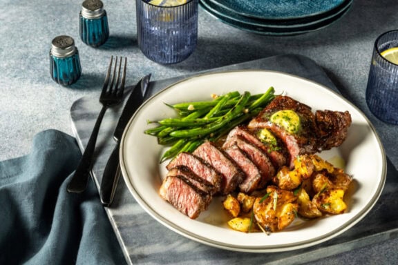 Looking to elevate your steak night? This Grain Finished NY Strip Steak with Herb Compound Butter is the perfect solution. Juicy, seared steak paired with crispy roasted potatoes and savory green beans—this meal brings together quality ingredients for a delicious, satisfying dinner. This recipe features ButcherBox Grain Finished NY Strip…