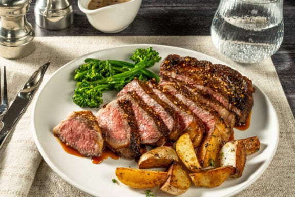 Treat yourself to a gourmet dinner with this Grain Finished Ribeye with Black Peppercorn Sauce. The ribeye is pan-seared to perfection, then drizzled with a rich, creamy peppercorn sauce, and served alongside roasted potatoes and tender broccolini. A perfect meal to impress or indulge! This recipe features juicy ButcherBox Grain…