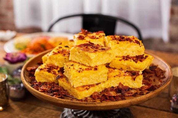 These warm polenta cakes bring a little extra comfort and flavor to any meal. The savory crunch of bacon paired with a hint of parmesan make these tasty cakes a perfect side for a soup, bread alternative or even a crouton in your favorite salad.