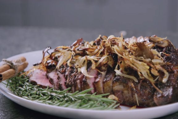 Meltingly tender with deep, smoky sweetness, this spice-rubbed roast is the hero of the dinner table. A bed of buttery onions and mushrooms soak up all the flavor nuances while it’s in the oven.