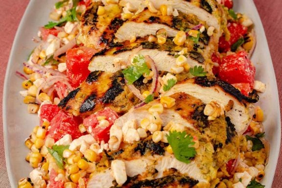 Summer is here with this grilled chicken and watermelon salad recipe. The grilled chicken breast brings the fresh flavors of garlic and rosemary to the table while the watermelon salad combines summer corn, watermelon and feta cheese for a side you won’t want to put away anytime soon.