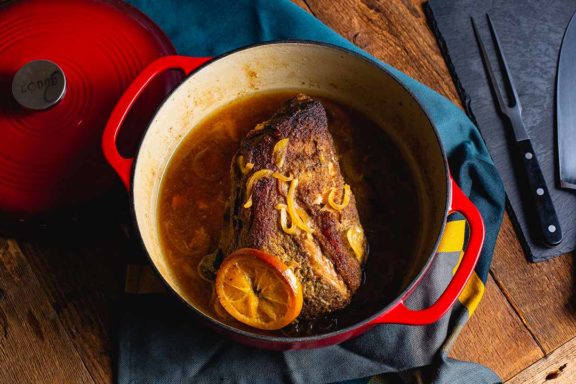 This pork gets an earthy, garlicky dry rub and is braised in orange juice and onions for amazing depth of flavor and tender meat. The cooking liquid also make a mouthwatering sauce!