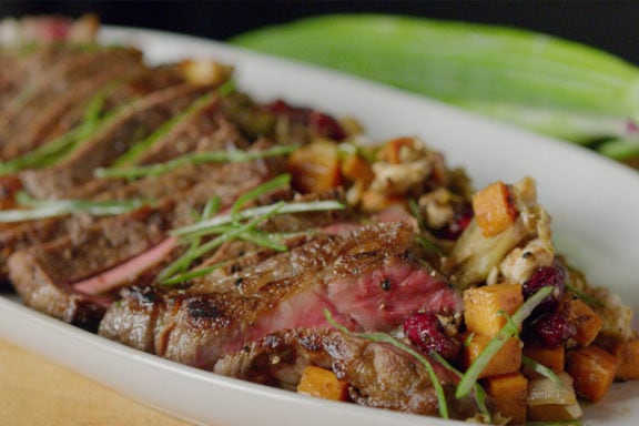 One-pan cooking has never been this delicious. Sear ribeye steaks in a hot skillet, then add the sweet potato hash ingredients. Everything roasts together for a sweet and savory meal.