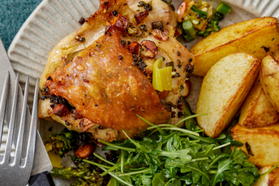 It’s all about the crispy skin on these chicken thighs! The bake to perfection with mushrooms and onions for an earthy dish with sweet roasted tomatoes.