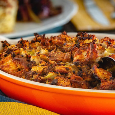 Sweet, tender apples, crusty bread, and meaty chunks of sausage stud this hearty stuffing. It makes a great side for a turkey or any roast.