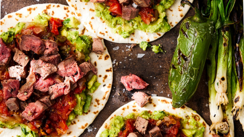 - Transfer the steak to a cutting board, tent with foil and let rest for 10 to 15 minutes. Grill the tortillas until just warm, then wrap in a clean kitchen towel. Chop the steak into small pieces and season with additional salt and pepper, if needed. Serve the steak with the roasted tomato salsa, guacamole, grilled scallions and jalapeños, and tortillas.