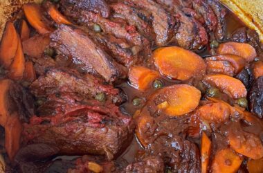 There’s nothing like a braise for making your kitchen smell amazing. Add the aroma of the luscious warm spices in Moroccan cuisine, and you’ll find yourself waiting by the oven for this dish to be ready. Along with our brisket, this dish also incorporates carrots, onions, dried apricots and capers…