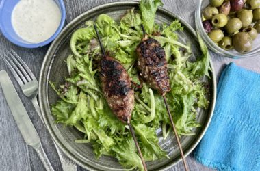 Made with a mix ground pork and beef, these juicy, flavorful kebabs are served over a salad with creamy feta dressing. Quick to assemble, this satiating summery salad is an ideal for a weeknight meal or last-minute cookout.
