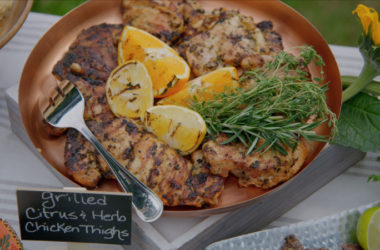 Summer is here with this grilled chicken and watermelon salad recipe. The grilled chicken breast brings the fresh flavors of garlic and rosemary to the table while the watermelon salad combines summer corn, watermelon and feta cheese for a side you won’t want to put away anytime soon.