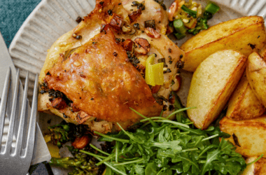 It’s all about the crispy skin on these chicken thighs! The bake to perfection with mushrooms and onions for an earthy dish with sweet roasted tomatoes.