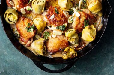 Super crispy skinned and tender meat chicken thighs, vegetal artichokes, bright wine, and crispy garlic oil make this feel super Mediterranean, week-night friendly, and just overall delicious. Plus, after you’ve bought a bottle of wine just for this recipe (a whole 2 cups is called for here), you’re left with…