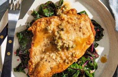 Chicken piccata, an Italian-American staple of thin pan-fried cutlets enveloped in a buttery rich and lemony bright sauce with briny capers, is truly special. It’s easy, calls for mostly pantry-ish ingredients and is just delicious. In this recipe, there’s the addition of wilted greens that are quickly sautéed in olive…