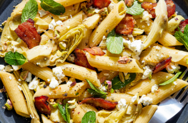 Artichoke and Bacon Pasta with Herbs, Feta and Pistachios