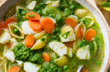 Cod and Spring Vegetable Minestrone with Ginger Pesto
