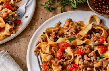 Inspired by the Italian soup “pasta fagioli”—or, as New Yorkers call it, pasta fazool–this pasta dish, featuring beans and Italian sausage, is coated in a buttery, spicy cherry tomato sauce. And let us tell you, this dish is comfort on a plate. It also showcases the versatility of ButcherBox’s mild…