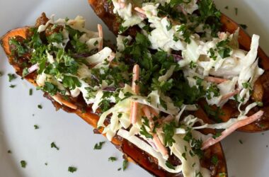 Sweet, spicy, tangy, creamy–each bite of these stuffed sweet potato skins brings all the flavor. Cooked with a bit of orange peel for a touch of brightness, ButcherBox Pork Carnitas crisp up in a skillet in less than 10 minutes. We mixed it with barbecue sauce, spooned that into baked…