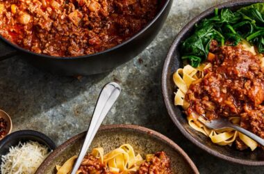 This makes quite a large batch of saucy and savory slow-cooked bolognese, famed meaty sauce that hails from Bologna, Italy. Here, ground beef, pork and bacon are the main characters, but they are supported by a vegetable medley, warm and cooling spices, orange peel and tomato to keep things bright…