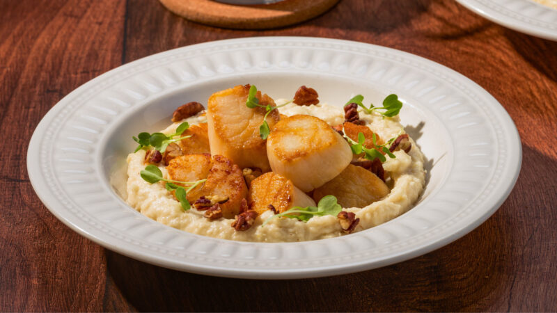 Chef Jason’s Seared Scallops with Pecans and Grits takes seafood and comfort food to the next level. Tender, perfectly seared scallops are served over creamy, cheesy stone-ground grits, finished with a decadent brown butter and toasted pecan sauce. With a touch of mascarpone and cheddar, this dish is a savory masterpiece that’s rich, flavorful, and sure to impress.