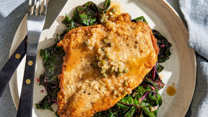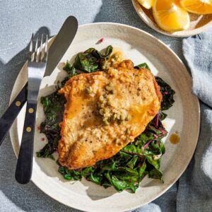 Chicken piccata, an Italian-American staple of thin pan-fried cutlets enveloped in a buttery rich and lemony bright sauce with briny capers, is truly special. It’s easy, calls for mostly pantry-ish ingredients and is just delicious. In this recipe, there’s the addition of wilted greens that are quickly sautéed in olive oil and garlic to round out the meal a little more and make you feel good if you decide to add extra butter than what’s called for here.