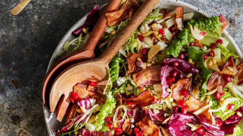 For this salad, sweet romaine, fennel and bitter chicories get tossed in a fried garlic and pine nut-oregano vinaigrette. ButcherBox Bacon and creamy feta top this salad that is simple yet complex with textures and greens, nuts and cheese. This is the beauty of a chopped salad—almost anything can go in one. Some other good additions are chopped olives, more and different herbs, roasted mushrooms, and even pomegranate seeds.