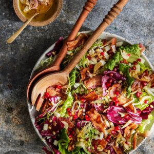 Try getting ahead on the fried garlic and pine nuts, as well as cooking the bacon, so that dinner can happen quicker. If you don’t feel like chopping so much, you may use baby greens like spinach and kale. Also, feel free to change the proportion of chicory to romaine if bitter isn’t really your thing.