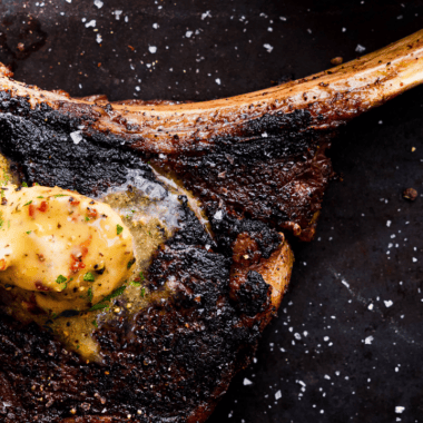 Chef Raymond Naranjo shares his recipe which he rightly describes as the “perfect balance of sweet to bitterness and spice”. This super savory grass-fed tomahawk steak is rubbed with a menagerie of spices that includes New Mexico famed red chile from Naranjo’s home state, molasses-y brown sugar and ground coffee. It’s an impressive cut of steak that is complimented by a zippy compound butter made he calls a “cowboy butter” that melts into the steak, further enriching each bite. To boot, the size of this tomahawk steak makes this a shareable cut for dinner. “It tells the story of the Wild West and transcends the audience to a simpler time when we lived off the Land” Naranjo says. He loves serving this steak with creamy roasted sweet corn with the milk from the cob used in base.
