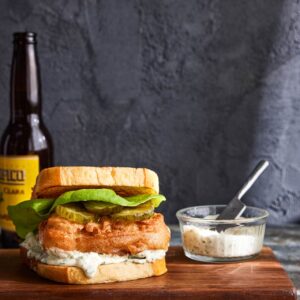 - Slather the tartar sauce on the inside of the bread slices, place the fried cod on the bottom pieces, top the fish with lettuce leaves and the top brioche slice then serve.