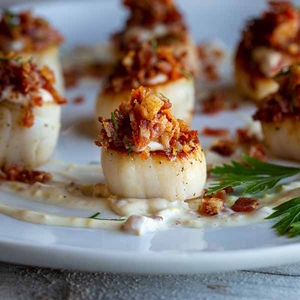 This delectable recipe features simply seared scallops, bacon, a splash of lemon juice, and a drizzle of cream sauce.