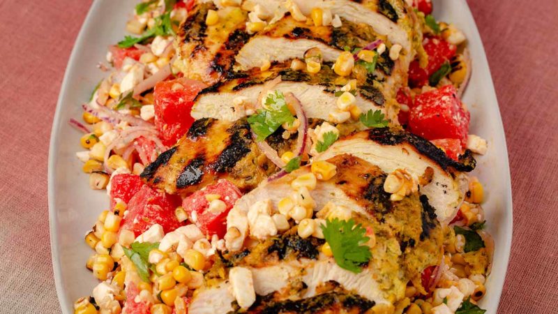 Summer is here with this grilled chicken and watermelon salad recipe. The grilled chicken breast brings the fresh flavors of garlic and rosemary to the table while the watermelon salad combines summer corn, watermelon and feta cheese for a side you won’t want to put away anytime soon.