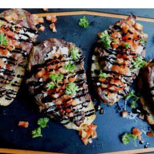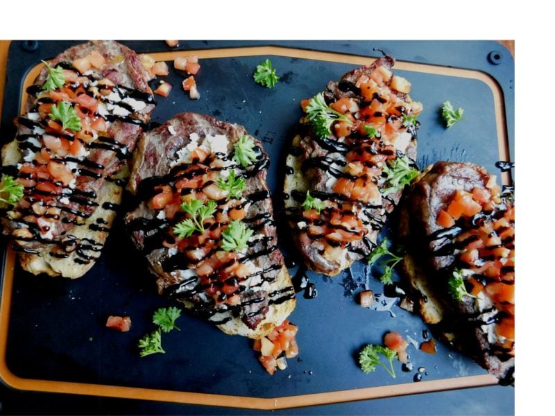 Bruschetta is a simple yet highly flavorful antipasto dish. Turn the garlic-rubbed Italian toast into a flavor-packed, open face steak sandwich by topping it with hot, juicy grilled ribeye and some special accompaniments. The reason why ribeye steak is so flavorful is that it has more marbling — the fatty connective tissue within the muscle — than most other cuts.
