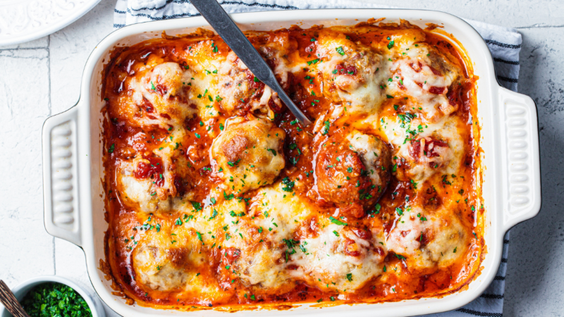 This meatball dish is a twist on an Italian cuisine classic. It comes together with simple pastry staples like Italian seasoning, black pepper, and tomato paste. Prepare this as a game day appetizer by forming smaller balls or enjoy it as a main dish. Serve with spaghetti or your choice of whole wheat pasta to keep things light. Top with fresh basil and red pepper flakes to enhance the mild flavors.