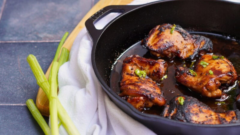 - Combine and Serve: Return the chicken thighs to the skillet, coating them with the sauce. Cook for an additional 1-2 minutes to ensure the chicken is well-coated and heated through. Garnish with sliced green onions and sesame seeds.