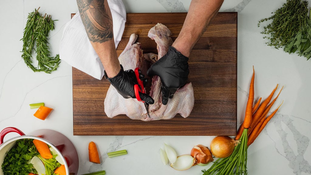 Step 3: Rotate the bird so the neck is facing you and repeat the cut along the other side of the spine.