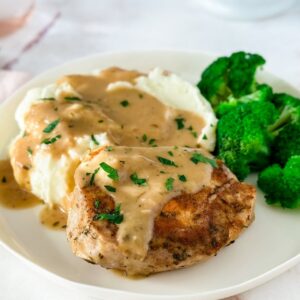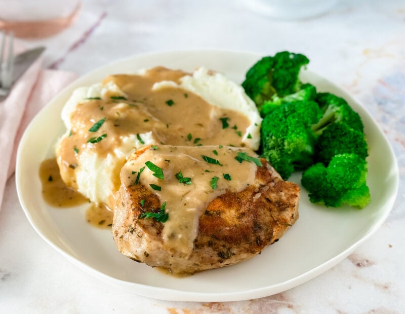 - Serve gravy over pork chops and mashed potatoes. Garnish with extra parsley or thyme if desired.