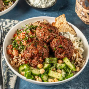 - In serving bowls, place a portion of the quinoa tabbouleh. Top with 3-4 lamb meatballs.