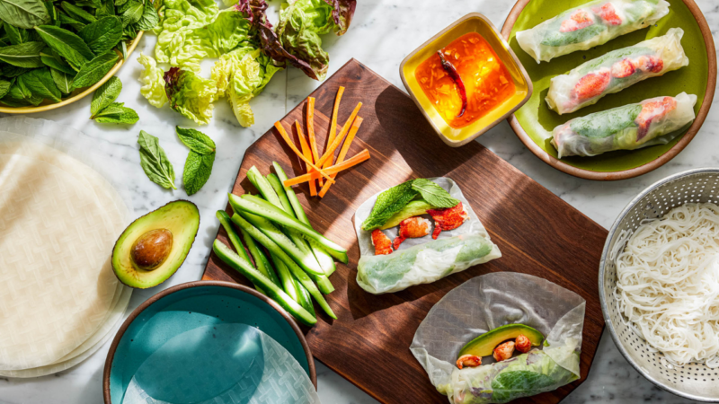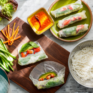 Rice paper rolls may seem intimidating, but they’re easy to master (and hey, if you need to unroll and re-roll a few, we won’t tell). These neutrally flavored wrappers, made from rice flour, water and sometimes tapioca starch, originated in East Asia, particularly in Vietnam and China. They’re firm at first, but when you soak them in a little water, they soften and become pliable.