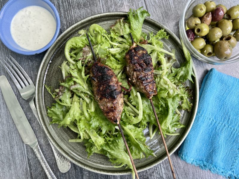 Made with a mix ground pork and beef, these juicy, flavorful kebabs are served over a salad with